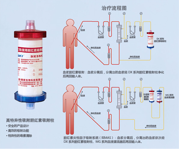 DX系列一次性使用膽紅素吸附柱(以下簡稱DX吸附柱)利用血漿分離器和血液凈化支持系統(tǒng),將高膽紅素血癥、高膽汁酸血癥患者的血液引出體外,經(jīng)血漿分離器分離出血漿,進行血漿吸附,清除患者體內(nèi)的膽紅素和膽汁酸,達到凈化血液的治療目的。